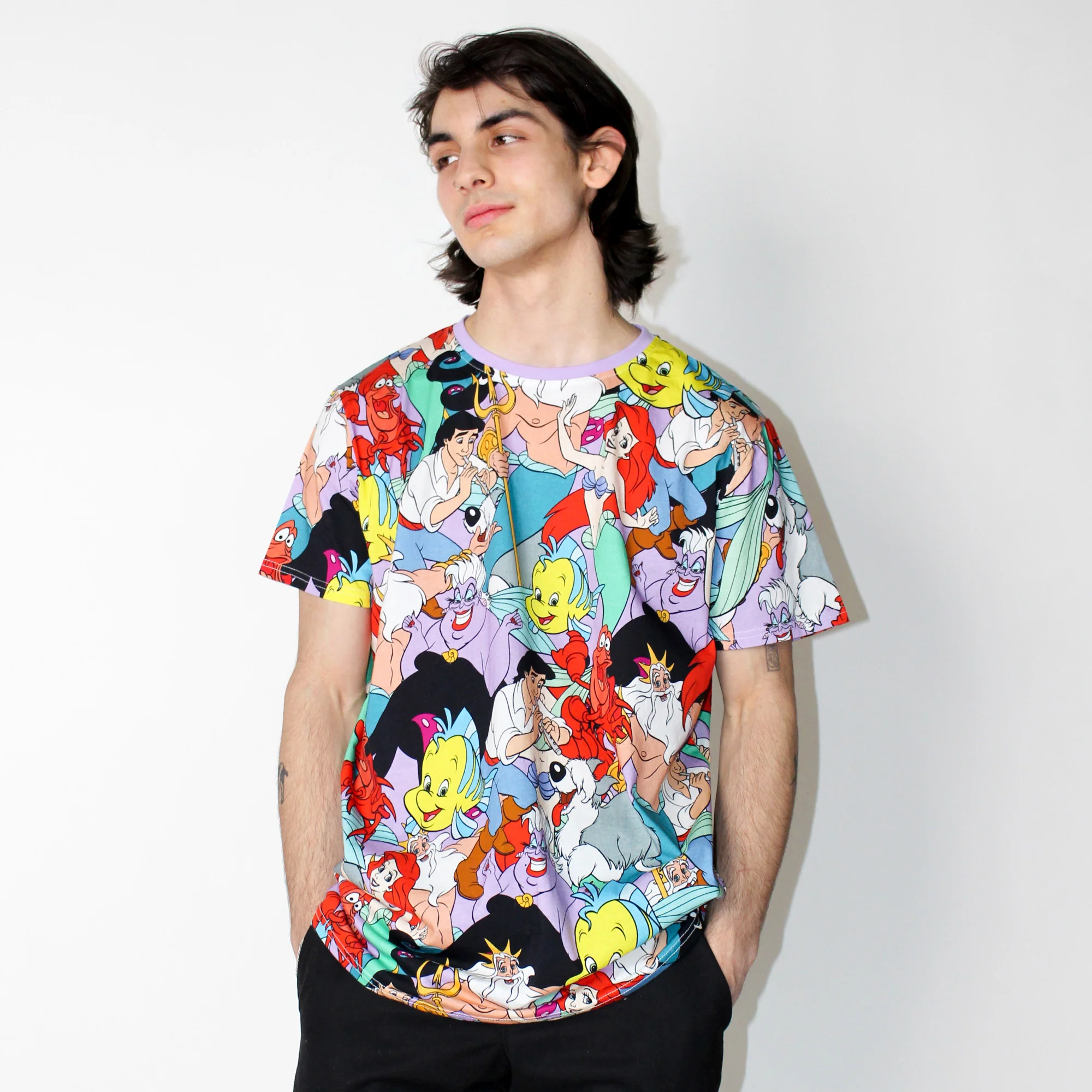Sing along with Disney’s Ariel and all her undersea friends! Our super soft unisex Disney Princess The Little Mermaid AOP T-Shirt featuring all your favourite characters like Disney’s Prince Eric, Flounder, Sebastian, Max, King Triton, and Ursula.